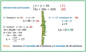 Tenemos un total de 26 monedas, algunas de 5 céntimos y otras de 20 céntimos. En total tenemos 265 céntimos. ¿Cuántas monedas tenemos de cada clase?